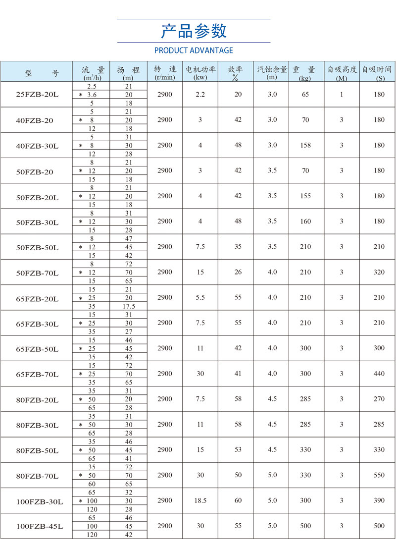 FZB型氟塑料自吸泵的主要部件有泵體、止回閥、前蓋、密封墊、泵蓋、葉輪、密封、軸承箱、電動機、底座。過流部件使用氟塑料合金制造。泵體部分由吸液室、儲液室、蝸殼、回流孔、氣液分離室等組成。當(dāng)泵啟動后,在離心力的作用下,泵體吸水室中的剩余液體與進(jìn)液管路中的空氣,被葉輪攪拌成氣水混合物;旌衔锝(jīng)蝸殼進(jìn)入氣液分離室,隨著流速的減慢,導(dǎo)致氣水分離,空氣由泵出口排出,液體經(jīng)回水孔返回泵內(nèi)。反復(fù)多次循環(huán),進(jìn)液管道中的空氣被排凈,使泵內(nèi)形成一定的真空度,達(dá)到自吸的作用。 FZB自吸泵是抽低液位腐蝕性介質(zhì)的理想用泵。尤其適用于抽吸低位槽工況,安裝時無需另配底閥,自吸高度范圍在1-5米內(nèi)。擁有更大的氣液分離室,通暢的回流通道,且進(jìn)口設(shè)計有先進(jìn)的止回閥,防止停泵后液體回流。泵高低壓區(qū)密封可靠,自吸時間明顯縮短,進(jìn)口抽空力強,大幅提升自吸性能。泵體設(shè)計有灌液孔、放液孔,最大限度滿足了不同工況下的使用需求。